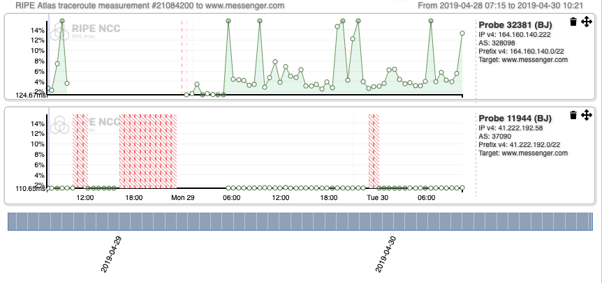 **Figure 8:**RIPE Atlas measurement, Recurring IPv4 traceroute measurement from all probes online in Benin to www.messenger.com, https://atlas.ripe.net/measurements/21084200/, April 28, 2019