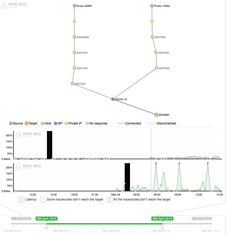 **Figure 11:**RIPE Atlas measurement, Recurring IPv4 traceroute measurement from all probes online in Benin to Google DNS (8.8.8.8), https://atlas.ripe.net/measurements/21083844/ (AS paths inferences during the shutdown), April 28, 2019