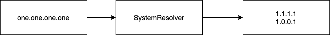 The following diagram illustrates what happens when you use the system resolver to lookup the IP addresses for the one.one.one.one domain name. In most cases, you will get two IPv4 addresses: 1.1.1.1 and 1.0.0.1 (as well as, possibly, IPv6 addresses), as illustrated below.