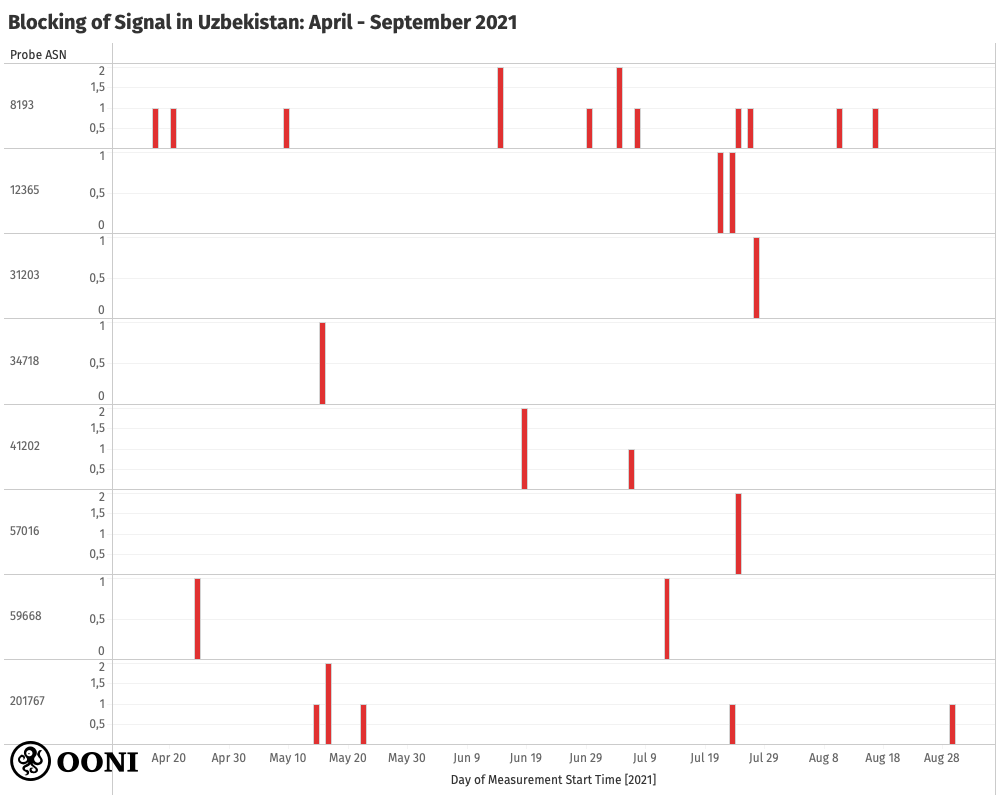 The following chart aggregates Signal measurement coverage from 8 distinct AS networks in Uzbekistan between April 2021 to September 2021, all of which present signs of blocking.