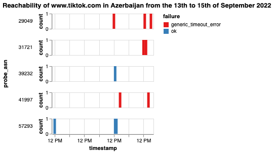 The OONI Probe testing of www.tiktok.com on 5 networks in Azerbaijan between 13th to 15th September 2022 can be further examined through the following chart, which shows that its testing consistently presented generic_timeout_errors on at least 3 networks by 15th September 2022.