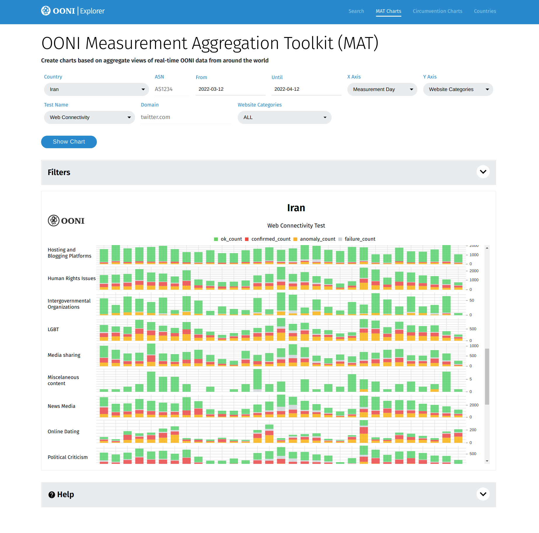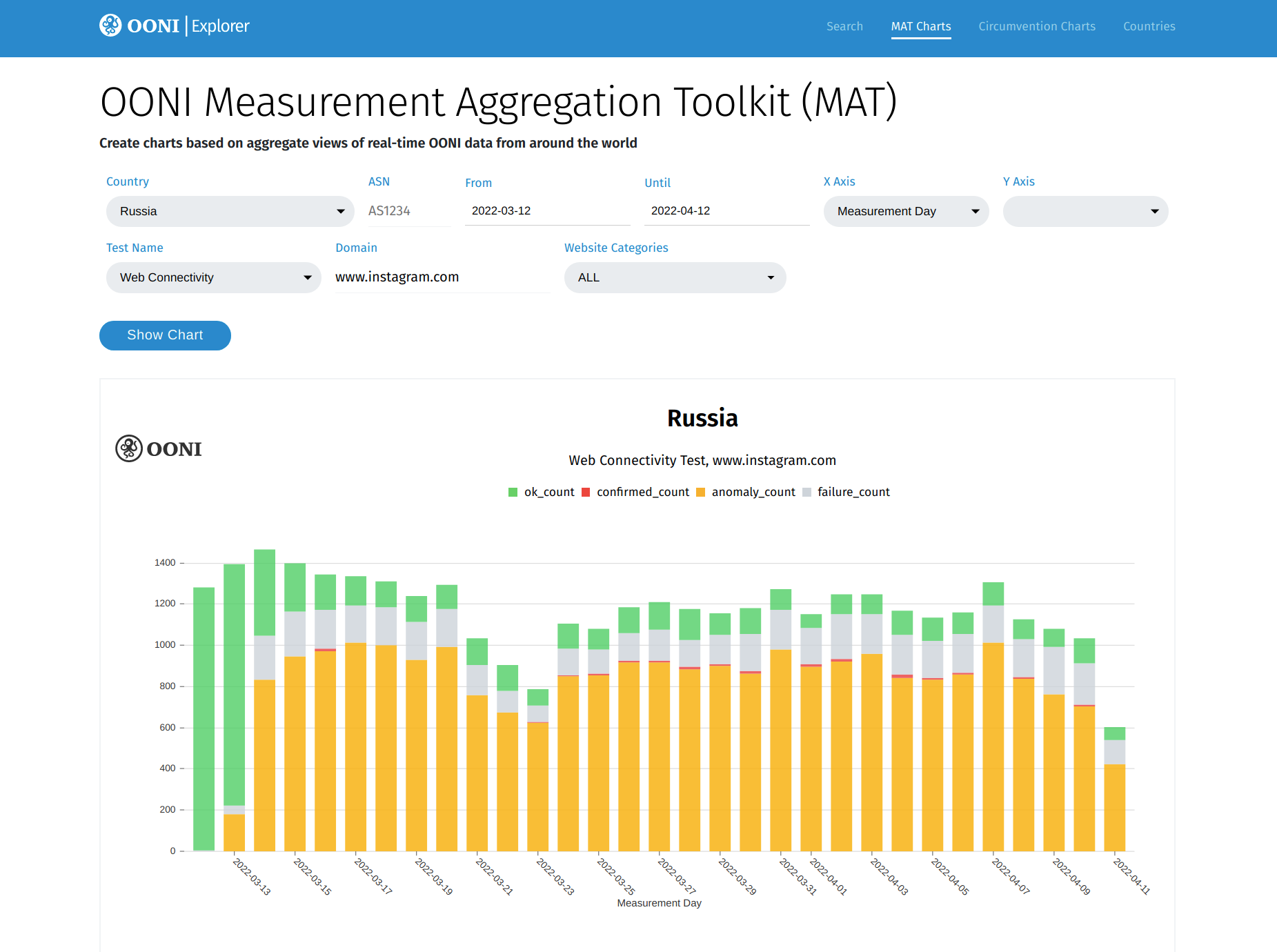 The MAT is a tool that enables you to create your own custom charts based on aggregate views of real-time OONI data collected from around the world.
