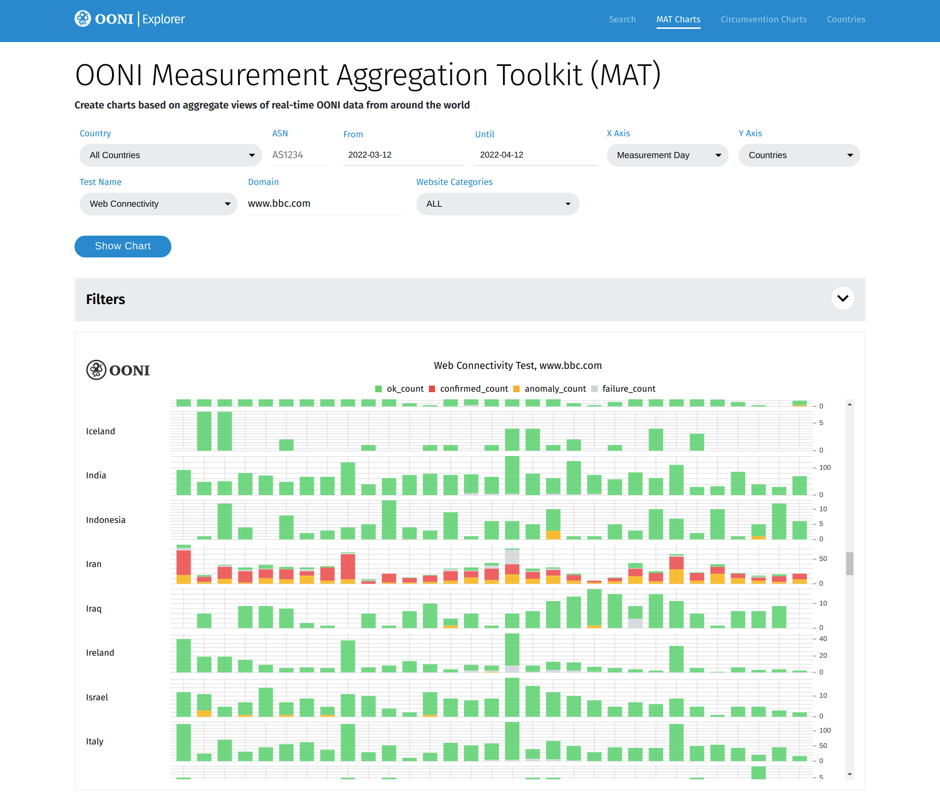 The MAT enables you to track internet censorship around the world and create your own custom charts based on real-time OONI network measurement data.