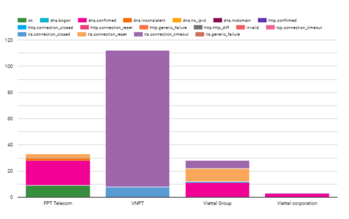 The raw data in this period from OONI included 301,847 tests. However, we have to filter and remove the ones that are untrusted. Normally tests of blocked sites will return a page with the same title. We counted 1108 blocked websites across 10 different networks of autonomous system number (ASN): of which 3 ASN’s networks belong to Viettel (Viettel CHT company, Viettel Group, Viettel Corporation), a military-owned internet service provider; 3 ASN’s networks of state-owned enterprises (VNPT, MOBIFONE, SaiGon Tourist); 1 foreign joint venture enterprise (Vietnammobile); 1 private-owned enterprise (FPT Telecom); 2 foreign enterprises (Home Credit Vietnam Finance, Softnet). Networks with suspicious signals that blocked users are networks that are heavily regulated by the government. There are 2 suppliers that do not block users who are foreign businesses. However, the number of tests is too small. So, it is impossible to confirm anything and it depends on the user to access which category is restricted by the government. The six main internet and mobile service providers of Vietnam blocked users; these are VNPT, Viettel, FPT, Saigon Tourist, MOBIFONE and Vietnam Mobile.