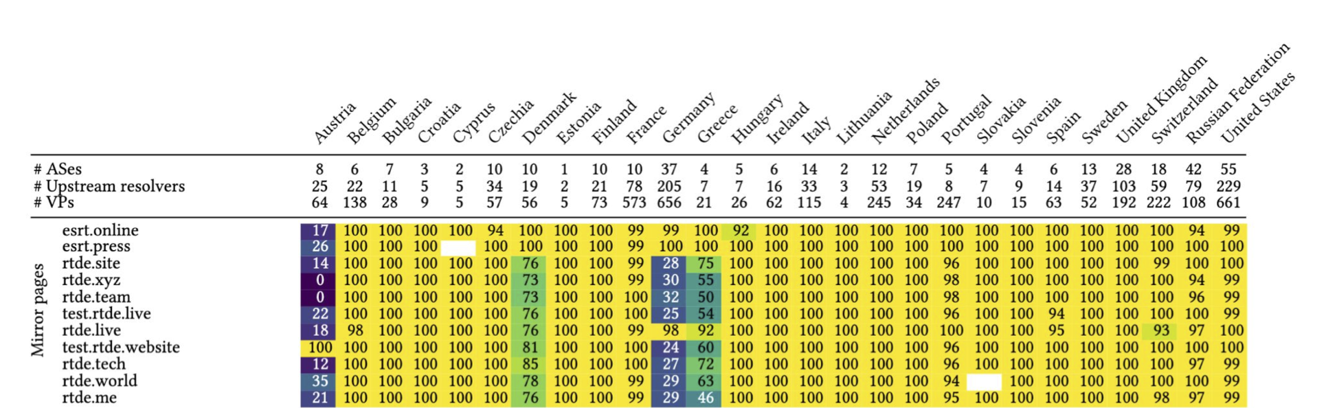 Figure 3 shows that most German and Austrian ISPs blocked at least some of the mirroring websites of the German version of rt.com (e.g. rtd.xyz or rtde.tech). In contrast, Spanish ISPs did not block the Spanish mirroring sites esrt.online and esrt.press at the time of our measurement. Note that there are also mirrors of rt.com in other languages, which we did not include in our measurements.
