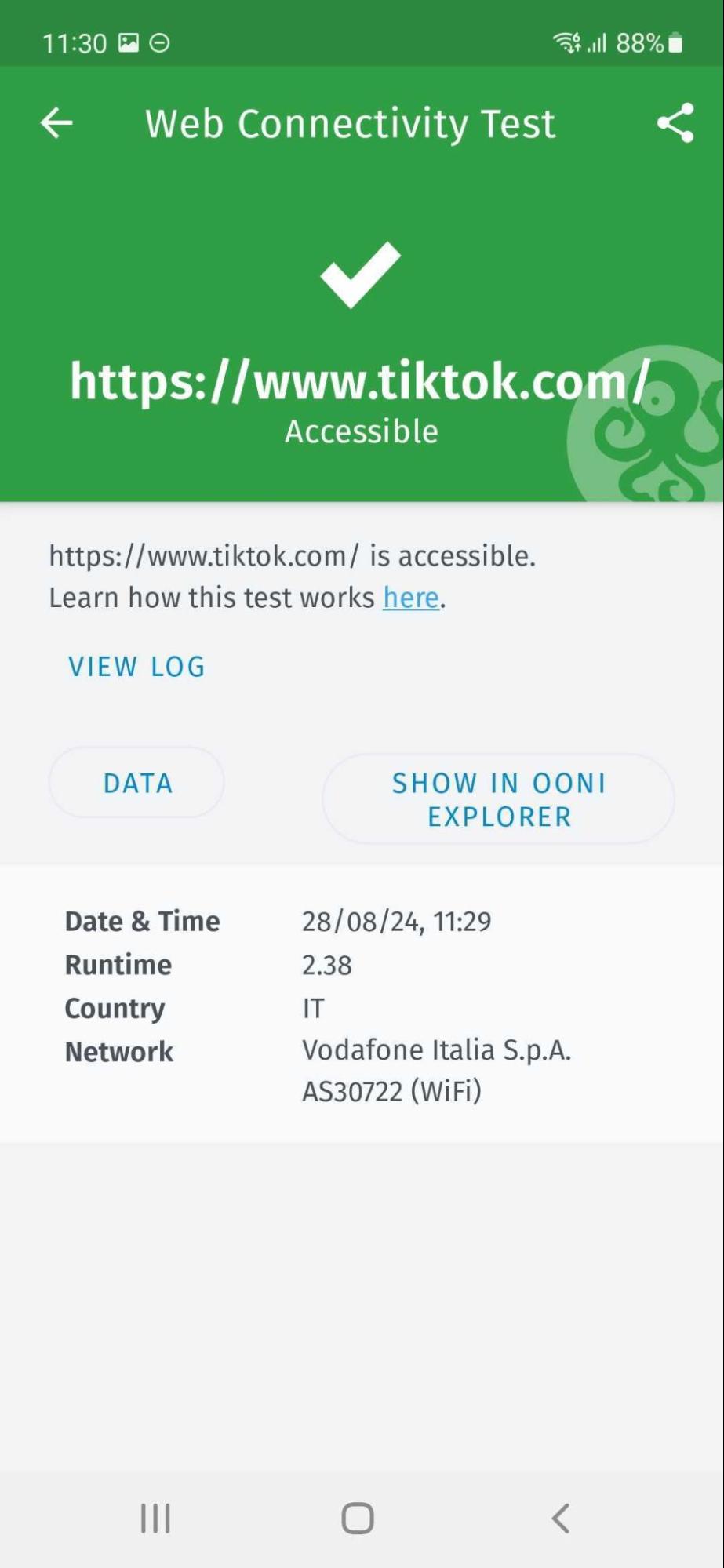 In the above example, we can see that TikTok was found accessible on the tested network. The “Data” button provides access to the raw OONI network measurement data, while the “Show in OONI Explorer” button provides a link to the published measurement. You can share the measurement through the use of the share button on the top right corner.