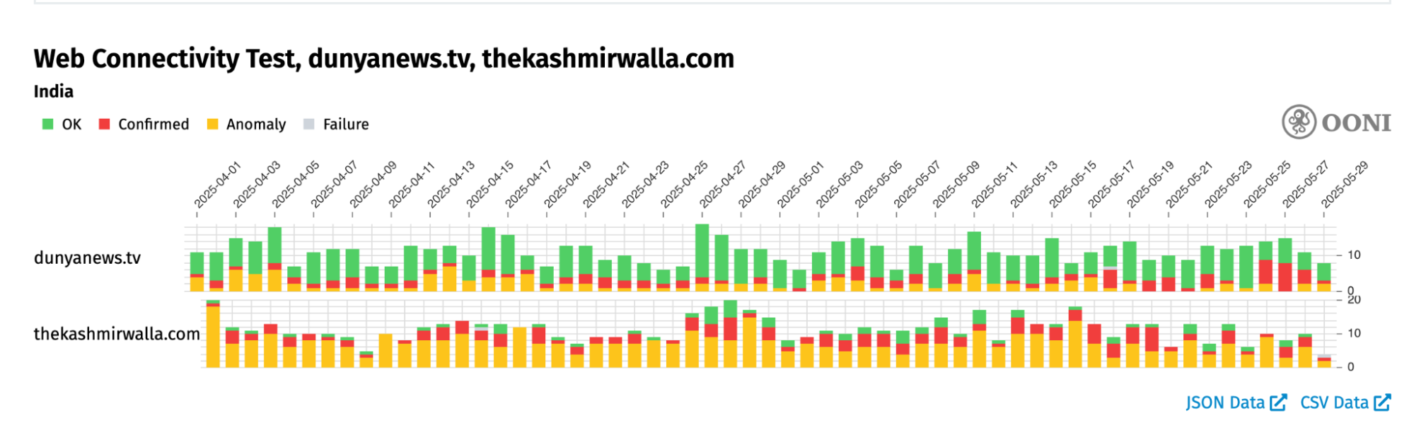 Chart: OONI Probe testing of indianexpress.com and www.indiatvnews.com in Pakistan between 1st April 2025 to 29th May 2025 (source: OONI data).
