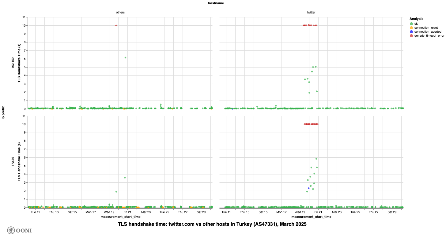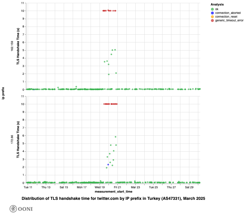 Chart: Distribution of TLS handshake times for twitter.com by IP prefix on AS47331 in Türkiye during March 2025 (source: OONI data).