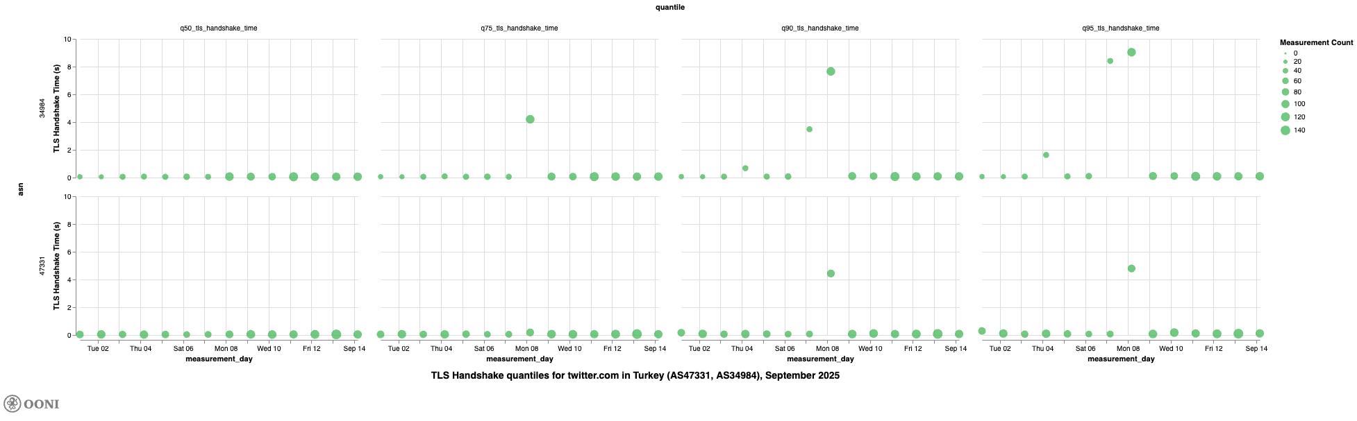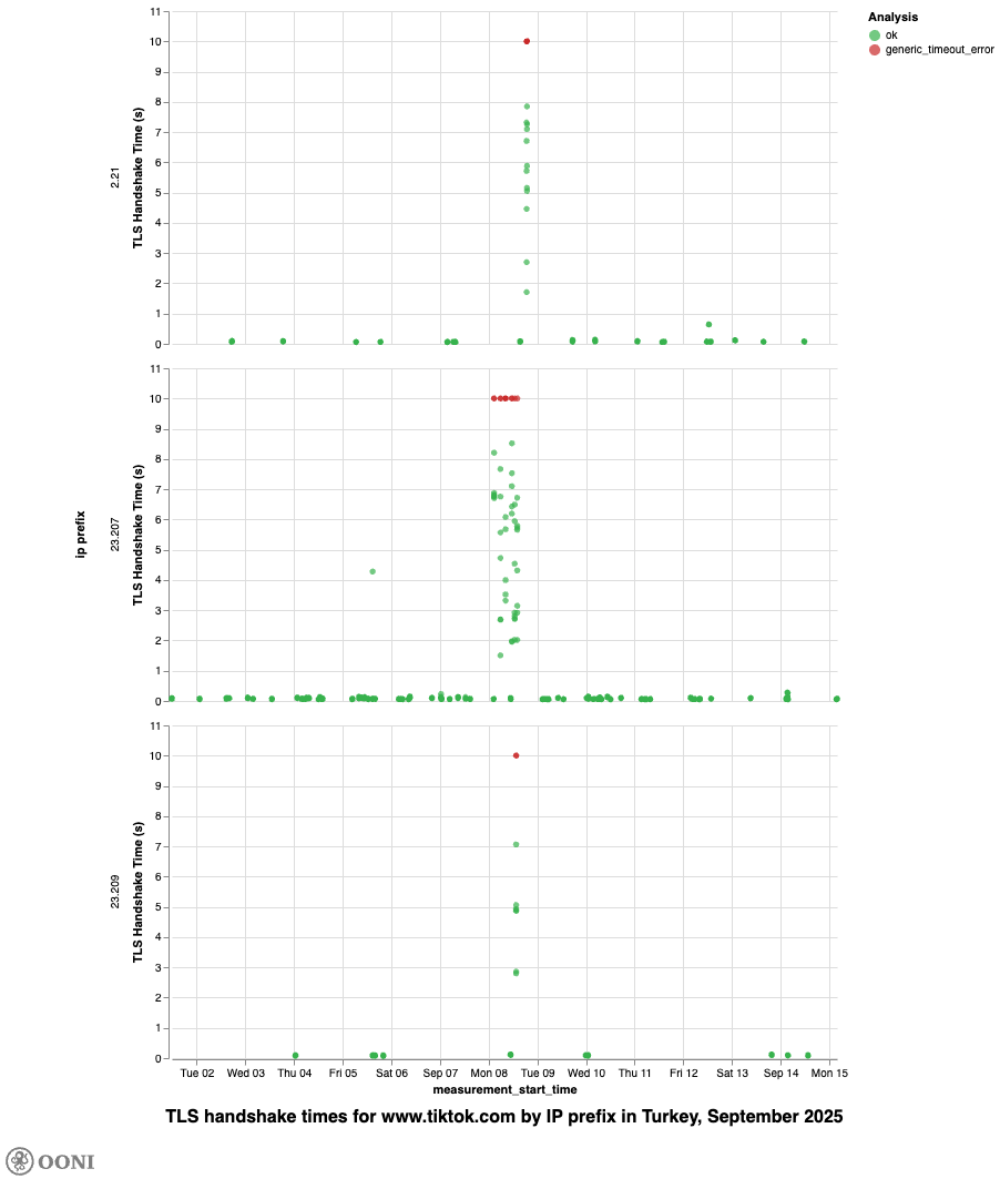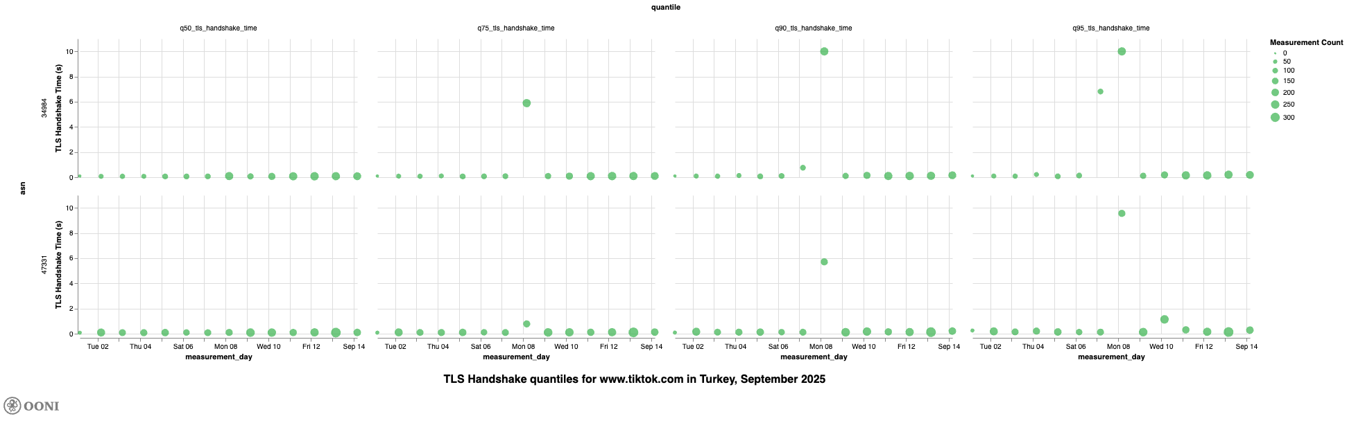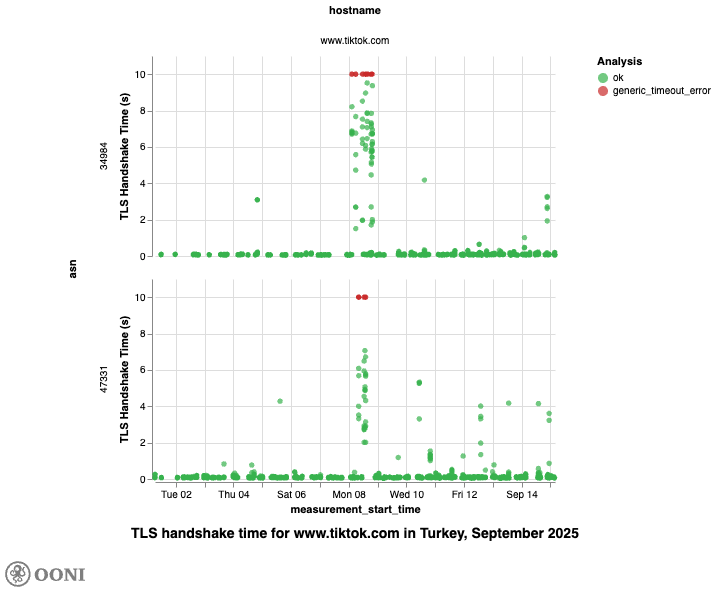 It’s worth noting, though, that we observe high TLS handshake quantile values for www.tiktok.com on TTNET (AS47331) and Turkcell Superonline (AS34984) on 8th September 2025, further suggesting that access to TikTok was throttled in Türkiye on that day.