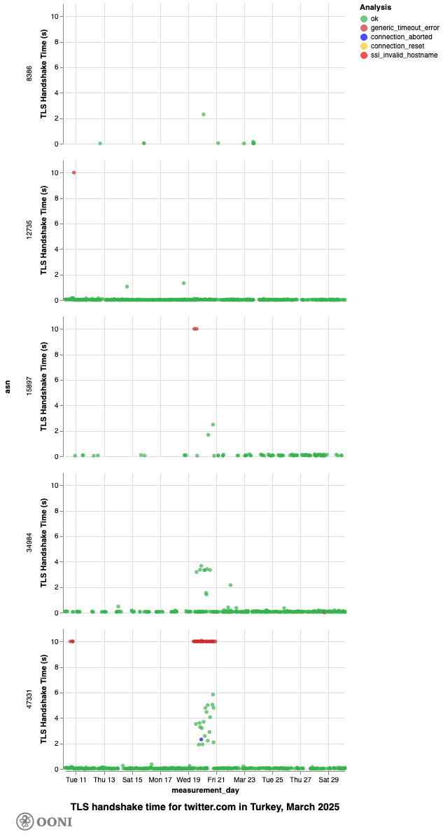 Chart: TLS handshake times for twitter.com on several ASes in Türkiye in March 2025 (source: OONI data).