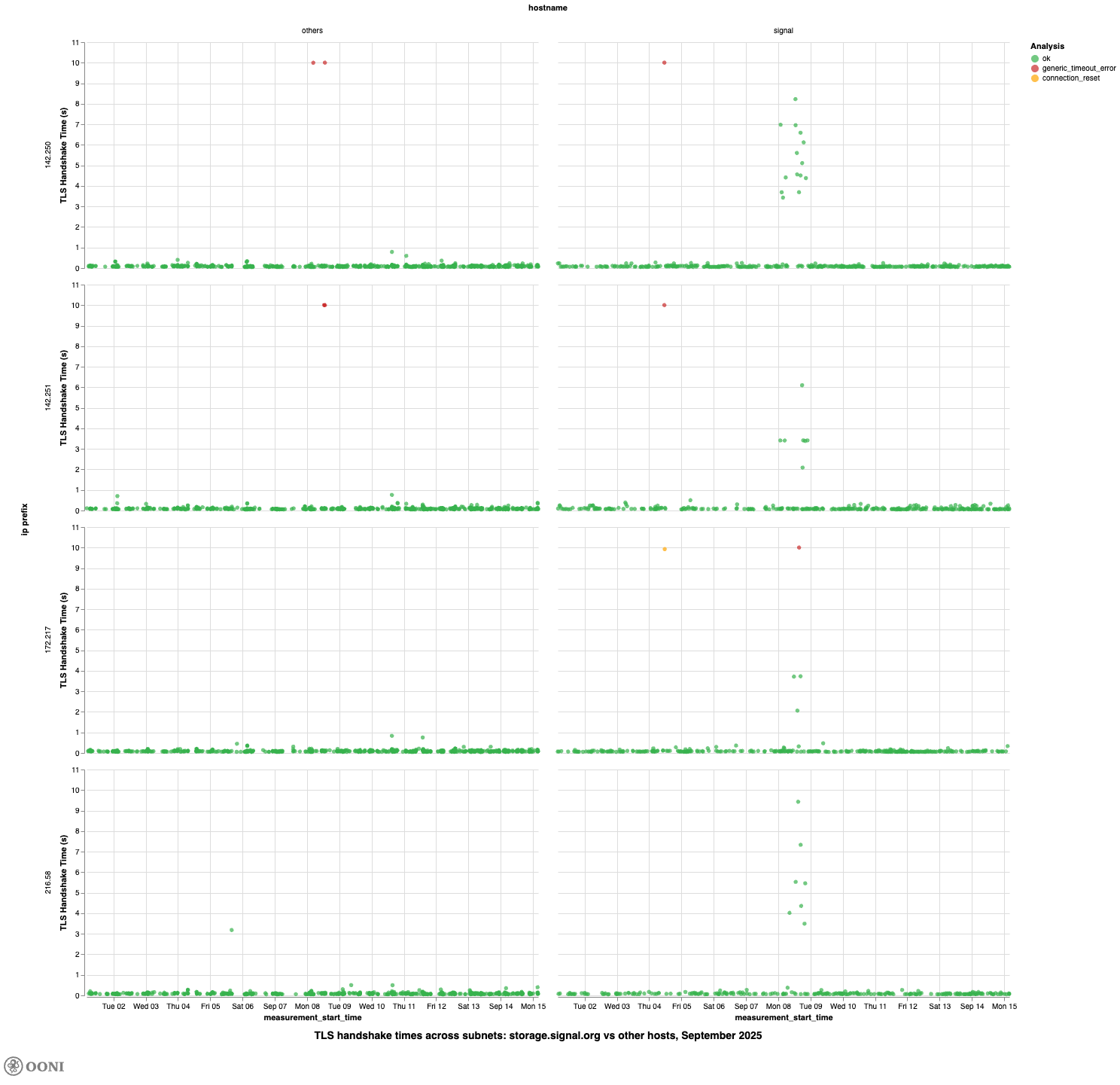 The following chart shows the TLS handshake times for storage.signal.org across each of these IP prefixes from 1st to 15th September 2025. As evident from the data, there is a significant spike in TLS handshake duration on 8th September 2025 across all prefixes, further suggesting that access to Signal was throttled on that day.
