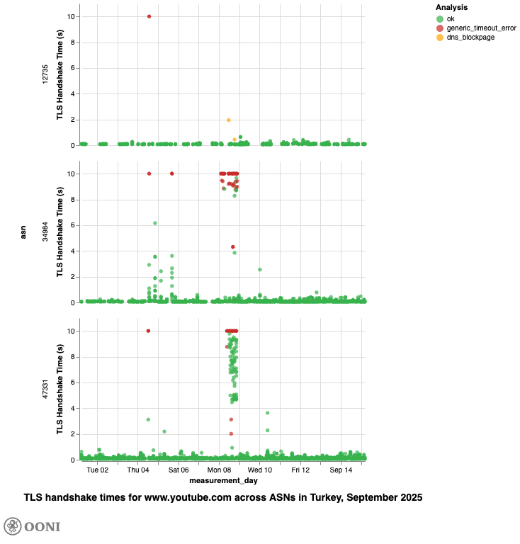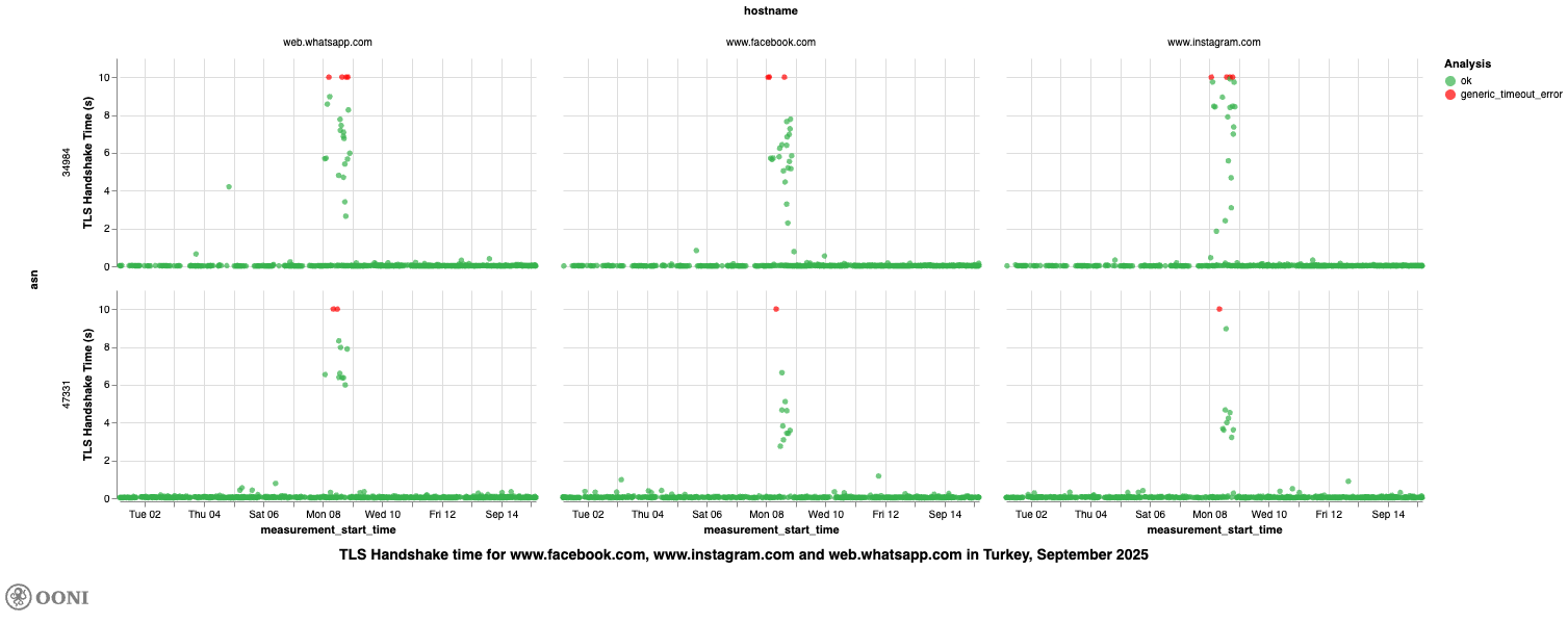 In this report, we present OONI data and findings from our investigation into the throttling of social media platforms across various networks in Türkiye during March and September 2025, periods when interference with these platforms was reported. Specifically, OONI data suggests that access to Twitter/X, Facebook, Instagram, WhatsApp, YouTube, TikTok, and Signal was throttled, whereas access to Telegram was blocked. Additionally, YouTube was blocked via DNS on TurkNet (AS12735). Details are shared below.