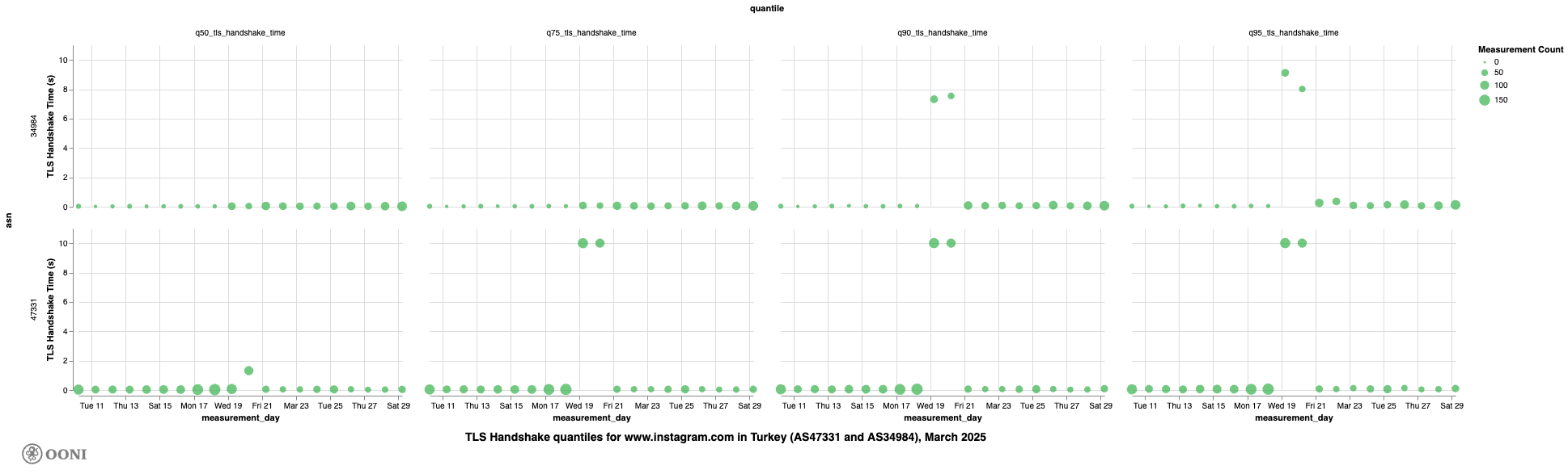 Chart: Daily TLS handshake time quantiles for twitter.com on AS47331 in Türkiye in March 2025 (source: OONI data).