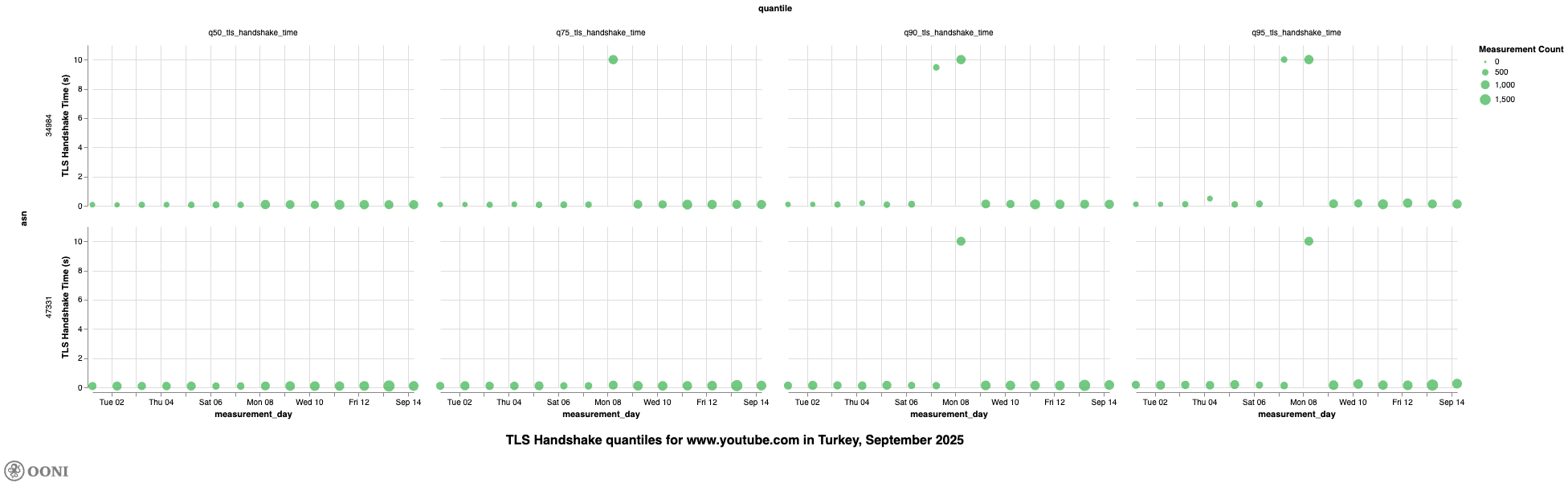 The long TLS handshake times observed on 8th September 2025 on TTNET (AS47331) and Turkcell Superonline (AS34984) – particularly when compared to the TLS times before and after this date – suggest that access to YouTube was throttled on these networks. This is further suggested because we observe high TLS handshake quantile values for www.youtube.com on TTNET (AS47331) and Turkcell Superonline (AS34984) during the same period.