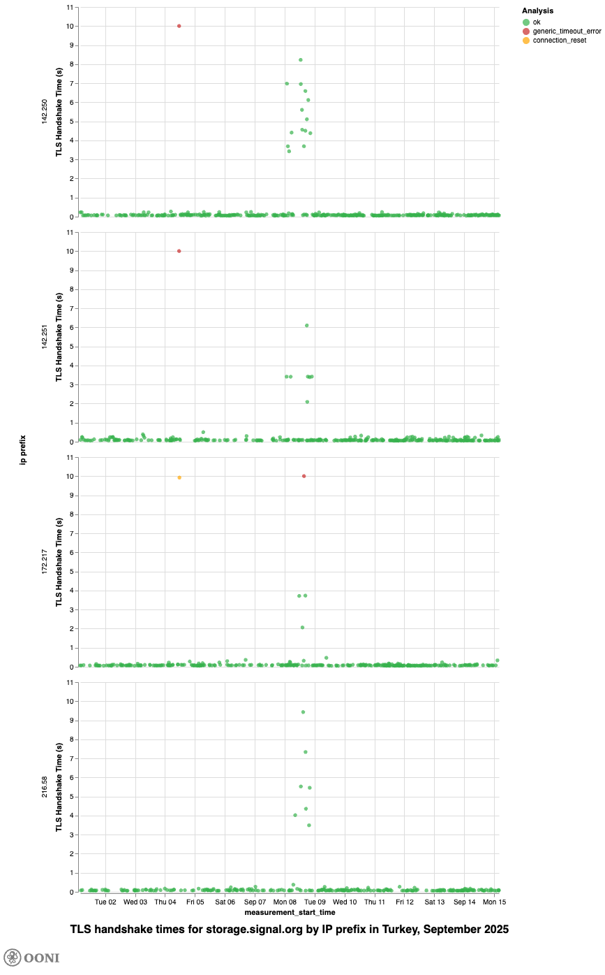 Given that the TLS handshake times for storage.signal.org were significantly longer than for 20 other hostnames sharing the same IP prefixes during the same period (from 1st to 15th September 2025), there is strong indication that access to Signal was throttled in Türkiye.