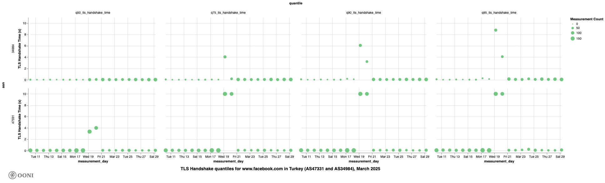 Similarly, we observe high TLS handshake quantile values for twitter.com on TTNET (AS47331) and Turkcell Superonline (AS34984) during the same period.