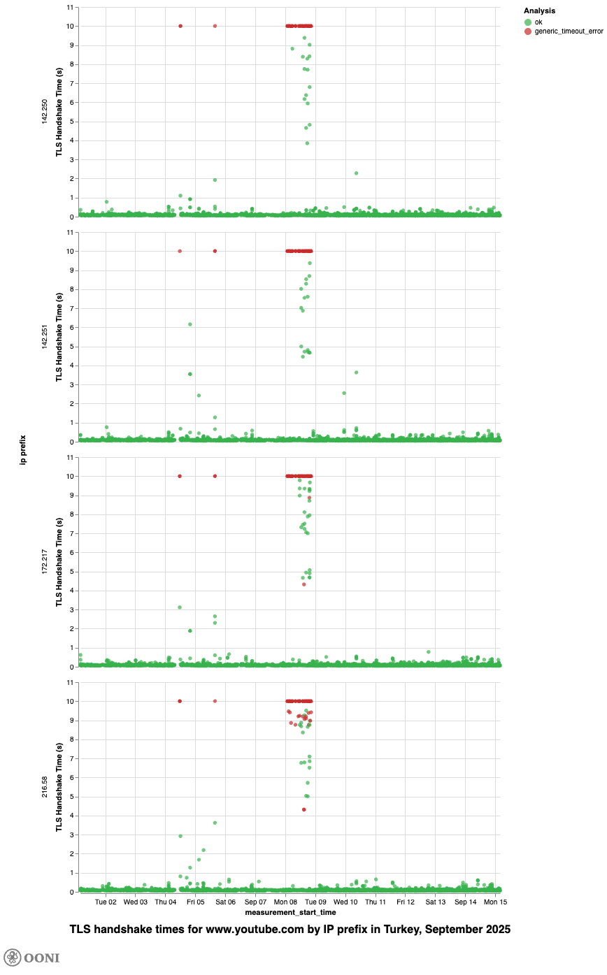 Chart: TLS handshake times for www.youtube.com on major IP prefixes in Türkiye from 1st to 15th September 2025 (source: OONI data).