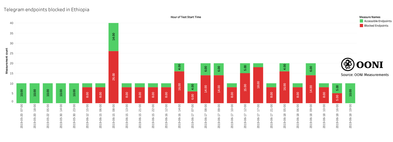 The following chart illustrates that most measurements collected between 12th to 18th June 2019 showed blocking of Telegram’s endpoints, suggesting that Ethio Telecom attempted to block access to the Telegram mobile app.