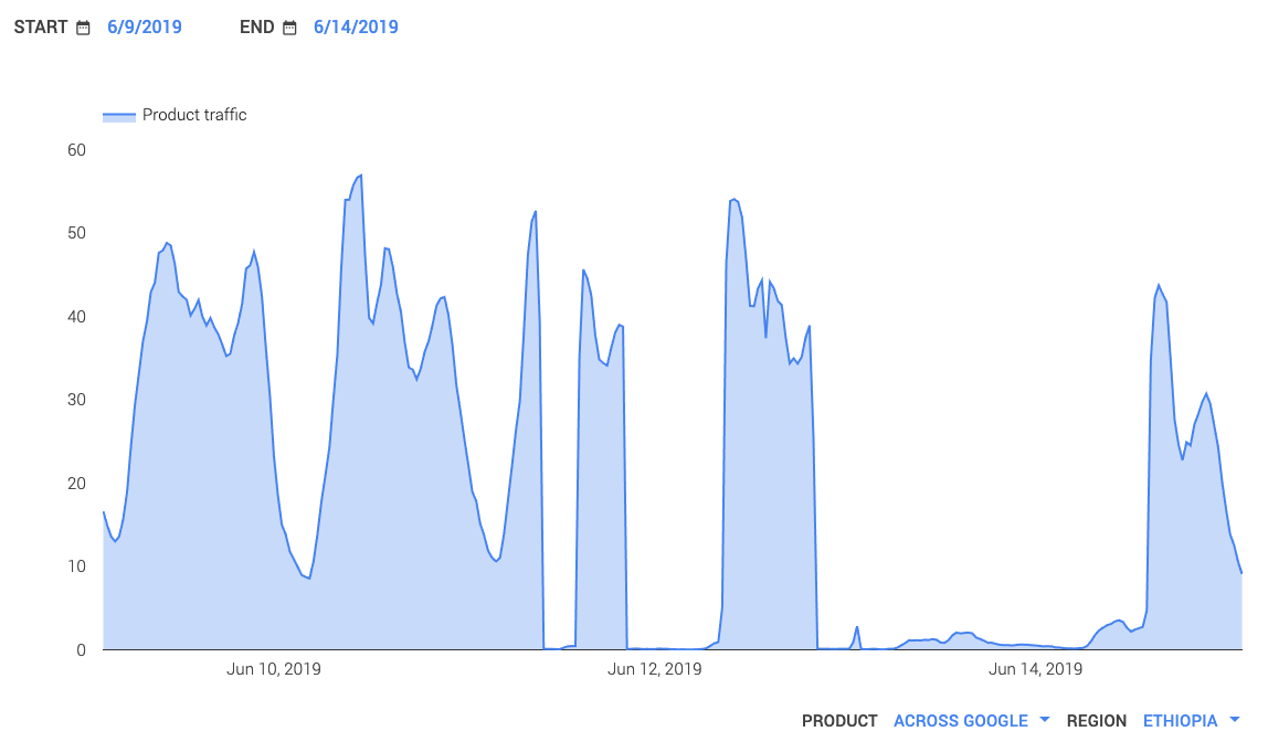 Between 11th to 14th June 2019, Ethiopia experienced three internet blackouts, as suggested by IODA and Google traffic data.